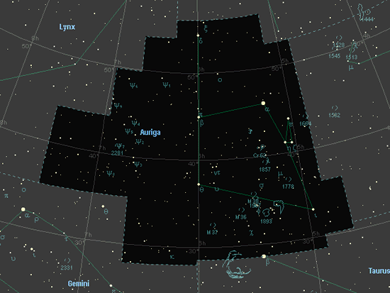 在初冬夜晚,当猎户座四边形升到头顶上方时,在东北方天空中可看到由5颗亮星组成的一个明亮而美丽的巨大五边形,这就是御夫座。其实,御夫座五边形最南的1颗亮星,是属于邻近的金牛座的。五车二是星座中最亮的星,也是离北极星最近的0等星,呈黄色。银河也通过御夫座,但是与人马座相反,这里正好是银河系边缘方向,所以银河的星雾是比较淡的。