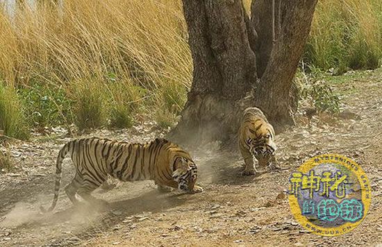 一位印度业余摄影师、野生动物热心人士拍下了一对老虎姐妹为争夺地盘大打出手的罕见照片。曾获奖的业余摄影师贾亚库马尔已在印度的国家公园工作了30年,他是负责动物保护工作的一名官员。他说:“我从事拍摄动物的业余摄影活动已经15年了,我从未见过这样的场景。与狮子不同,老虎不是群体性动物,它们独自行动,不愿意让同类陪伴在身旁,所以同时看到两只老虎是很少见的,更不用说看到它们为争夺地盘而大打出手。这是自然界非常少见的现象”。