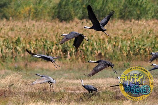 这是记者9月20上午在扎龙自然保护区拍摄的群鹤齐飞的照片,经鸟类专家鉴定,左下方的一只是国家二级保护动物沙丘鹤,其他为白头鹤。这是齐市继2002年由环保志愿者高友兴发现并拍摄到沙丘鹤后第二次记录。沙丘鹤又叫棕鹤或加拿大鹤,是大型涉禽,体长100~110厘米。沙丘鹤在国外分布于俄罗斯西伯利亚的极北部,北美洲的加拿大、美国和古巴等,是世界上数量最多的鹤类,国内分布数量极少,江苏北部和江西鄱阳湖等地仅有少量记录,属于罕见迷鸟。先前齐市已有丹顶鹤、白枕鹤、蓑羽鹤繁殖记录和白鹤、白头鹤、灰鹤的迁徙停留记录。