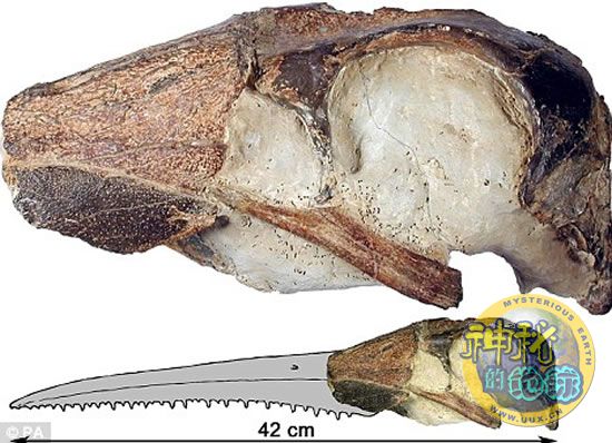 科学家们还发现,Dasornis与现代的信天翁在很多方面具有极高的相似度。德国法兰克福肯森堡研究所的鸟类学家杰拉尔德-梅尔(Gerald Mayr)表示:“想象一下它们象鹅一样可以在水中潜行,体形却差不多有一架小型飞机那么大。以现今的标准来看,这是一种很奇怪的动物,但最为奇怪的是,它们的嘴很尖,具有骨质的凸出部分,边缘还很锋利。虽然和所有现今鸟类一样,Dasornis的嘴都是由角质构成,这些物质与我们头发和手指的成分相似,但它们还有骨质状的假牙。鸟类的祖先为了减轻体重使得飞行更为容易,牙齿早在1亿年前便被进化掉了。因此现存的鸟类都没有真正意义上的牙齿,但是象Dasornis这样的生物具有骨质牙齿,这意味着它们的嘴在演变成钉状结构时牙齿又进化回来了。”据悉,目前该化石保存在德国卡尔斯鲁厄自然历史博物馆(Karlsruhe Natural History Museum)里。