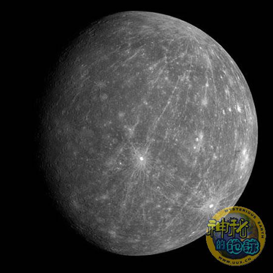 从其中一张新照片上可以看到,从最近拍摄到的一个年轻陨石坑内发出的像射线的图案,越过这颗行星的大部分表面向南延伸。以前拍摄到的柯伊伯(Kuiper)陨坑和其他陨坑也拥有向外放射的类似网线。