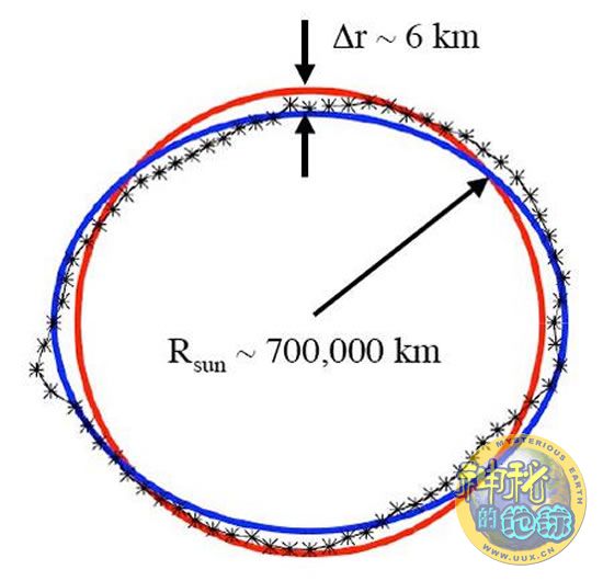 据美国宇航局网站报道,在美国宇航局拉马第高能太阳光谱成像探测器(以下简称RHESSI)帮助下,科学家对太阳的圆度进行了精确度空前的测量。测量结果显示太阳并不是一个完美球体。在活动较为剧烈的年份,太阳会形成一层薄薄的“香瓜皮”,在很大程度上增加了其外观的扁率,此时的赤道半径略大于极半径。