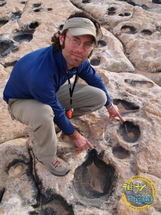 事实上,在将这一遗址确定为恐龙足迹以前,常教授一直将其称为“壶洞”(pothole)。当2005年常教授因为一次偶然的机会接触到这些“壶洞”的时候,他就被它们所吸引,同时也被它们奇特而又奇怪的现象所迷惑。“当我看到这些壶洞的时候,我就感觉它们一定不简单,虽然我们此前一直认为它们就是化学腐蚀形成的,但是我总是感到不同寻常。因为这块遗址的表层结构高度集中,可是再紧连着的土地机构却与其大相径庭。然而同时我又无法证明我的感觉是正确的,因此这件事就一直搁置起来。”与此同时,在2006年常教授的合作伙伴舍利教授首次看到这块遗址时,也马上认为这块土地被化学成分所腐蚀,然而就在其来回踱步观察整个土地概况后,依靠科学家固有的敏锐洞察力,他得出结论,这块土地必定是恐龙的脚印痕迹。虽然当这两位科学家将他们的推论公布后,相当一部分考古学者并不认同他们的观点,甚至激烈的对其进行反驳。后来常教授协同舍利教授对这块遗址进行了细致勘探,他们发现:四种不同类型的脚印形状的凹痕在其中约14%左右的痕迹中反复出现,而这其中的爪痕以及脚趾的痕迹清晰可见;此外其他痕迹也与此相仿。这些痕迹并不平整;相反,可以从这些痕迹中清晰地看出它们是以某一角度方向被嵌入的,同时能够清楚地显出运动的痕迹。而事实上运动的效果正是由痕迹上的小砂求所表现出来的,而这也能够反映出一种普遍的共性。除此之外,还有一个十分重要的特征,那就是在平均每个脚印轨迹的8分之一处总是有与其他轨迹重叠的部分。“也许我们可能会在港接触这片地带的时候认为这里是由于自然现象的化学腐蚀后形成的,然而当我们仔细的观察这些痕迹的细节后就会发现事实并不是这个样,这些先入为主的判断是不正确的。