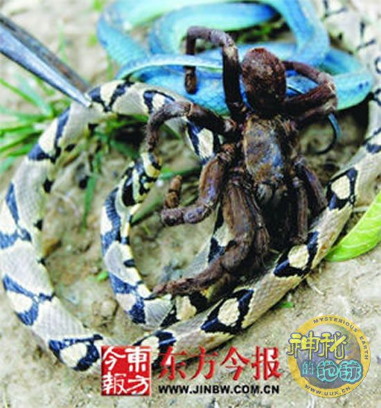 早上7时40分,郑州市金水区石经巡防中队的买宝平来到纬一路3号院,准备开始一天的巡逻。停放自行车时,买宝平一低头,发现小区草丛间竟然有两条蛇缠在一起,在它们身上还趴着一只约10厘米长的蜘蛛,蛇一条青色、一条黄黑色,蜘蛛呢,比平常的蜘蛛明显粗壮,一条腿就有筷子那么粗。买宝平吓了一跳,挥着警棒喊同事:“快来,两蛇大战蜘蛛王!”