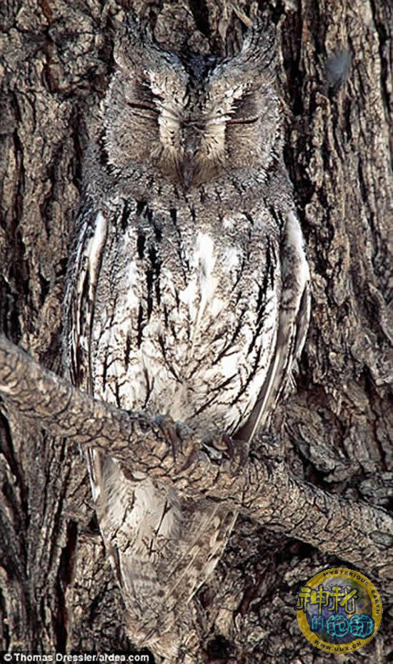 这种善于进行伪装的鸟名叫非洲耳鸟,它们在夜间捕食昆虫或者蜘蛛时不需要进行伪装;不过当白天来临,这种鸟在树干上休息时,情况就大不一样了。这种鸟的体型较小,身长仅为16厘米左右,因此很容易成为其它鸟类猎捕的食物。因此它们在白天休息时,都会紧紧地将身体贴在树干上,鸟身上有斑点的棕色羽毛以及灰色翅膀让它们和树融为一体,使敌人很难发现。