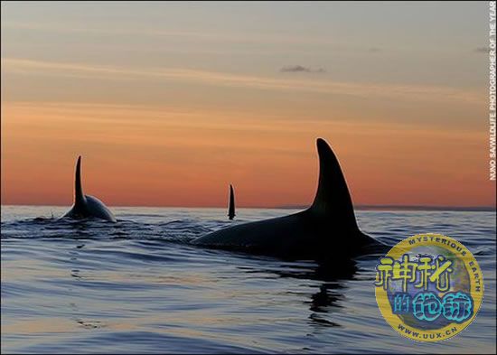 日落时分在海平面活动的一群虎鲸