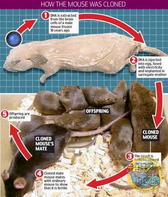 英国生物学家马尔科姆-艾莉森教授认为,“利用冰冻了16年之久的老鼠细胞克隆出新的生命,这与当年多莉出生采用的是同样技术。但为什么一些灭绝动物不能同样克隆呢,科学家们一直未能找到原因。”克隆冷冻鼠的实验由日本神户发育生物学研究中心若山照彦博士等科学家具体实施。他们从一只普通的雄性死亡老鼠的身上提取脑细胞并剥离出细胞核。然后,将剥离出来的细胞核与一个卵细胞结合,完成人工受精。当卵细胞受电流激活后,开始分裂并长成一个新生命胚胎。数日后,胚胎被置入代孕雌鼠的子宫之内。三周后克隆幼鼠出生。据研究人员介绍,这些克隆幼鼠并未出现任何畸形,而且已进入成年期。
