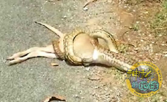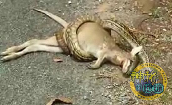 巨蟒正努力地试图吞进袋鼠的身体部位