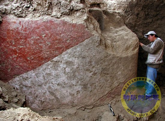 An archaeologist works on a painted wall at the newly discovered temple of Ventarron in northern Peru.