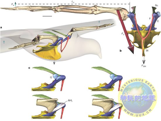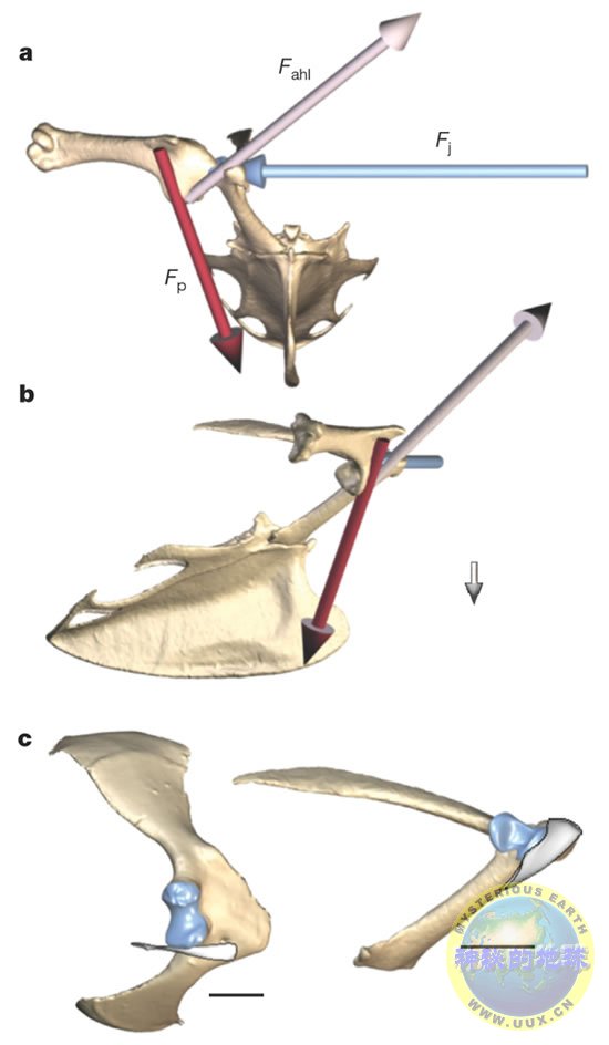 关于飞鸟从不能飞的祖先演化而来的长期争论,往往集中在单独的翅膀功能的不同方面上。但是现在,研究人员将比较解剖学、三维扫描和机械测量方法结合在一起,识别出一种解剖特征,该特征在真正受控飞行的演化中可能是一个关键步骤。被称为“acrocoracohumeral ligament”的韧带是由纤维组织构成的一个环,其作用是稳定翅膀,使其不向下降落,并且由于它不是肌肉的,所以该韧带不用费力就能发挥这种功能。这个韧带在如始祖鸟等已经灭绝的早期鸟类身上要么不存在,要么发育很差,所以它们需要用肌肉的力量来维持稳定的飞行。