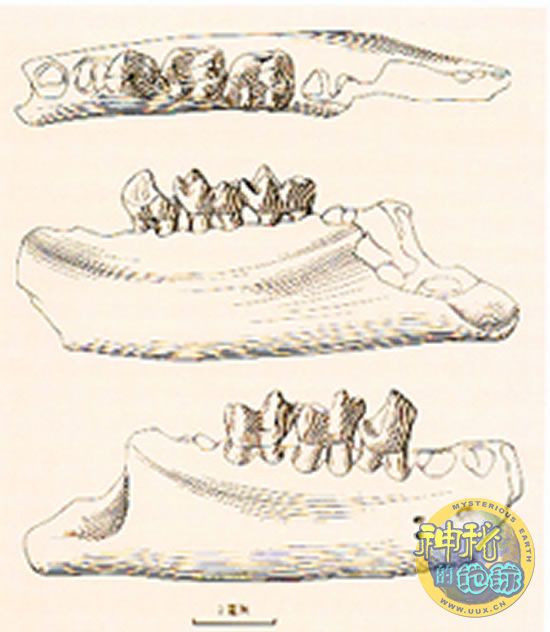 中华曙猿:下颌骨,具P4-M2及C1-P3和M3的齿槽。上-下:咬合面视、舌侧面视、颊侧面视