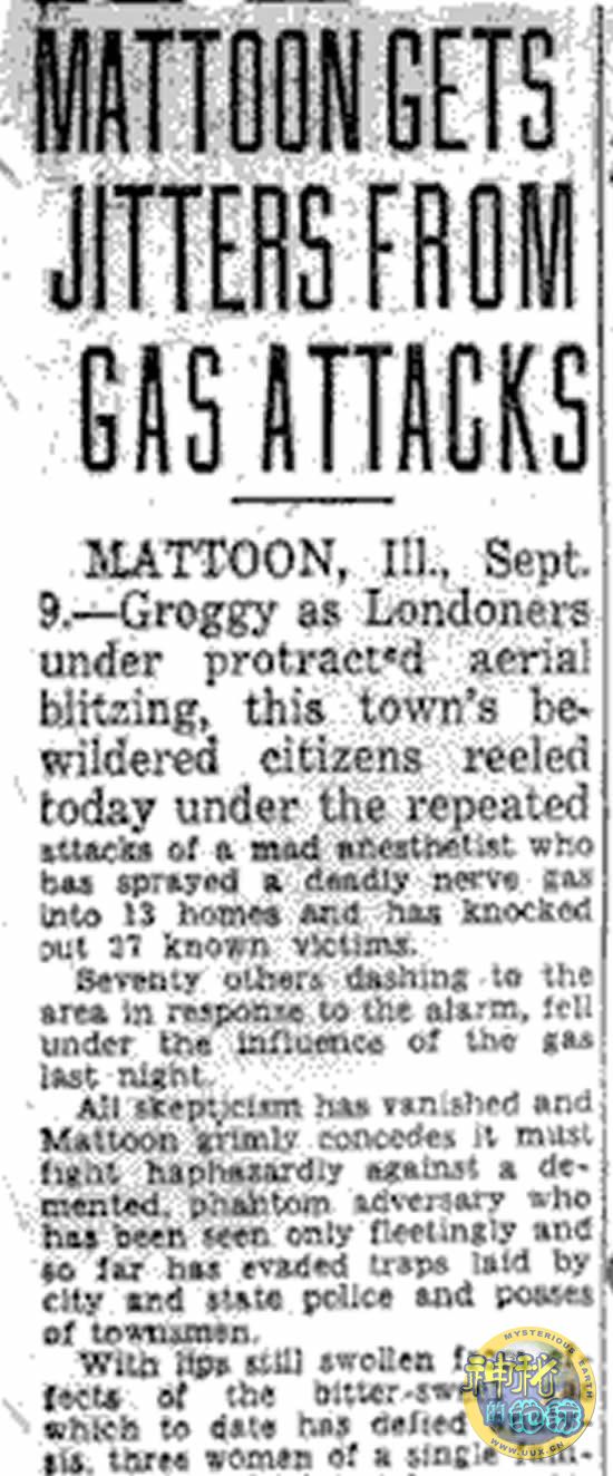 马顿的疯狂放气人是那些隐藏在一系列气体袭击案背后的人。这些案件发生在上世纪三十年代初的美国维吉尼亚州的伯特图尔特县,以及上世纪四十年代中期的美国伊利诺伊州的马顿。据报道,第一起气体袭击案发生在伯特图尔特县的黑美克镇的卡勒·霍夫曼的家中。当夜,该镇就有三起这样的案子被曝光。霍夫曼太太说:“在1933年12月22日晚上10点钟左右,她闻到一股异常的味道,然后就感到一阵恶心,这种味道和恶心大约在10点半又卷土重来。此时,霍夫曼先生与警方取得了联系。第三次袭击发生在大约凌晨一点,这次影响到了整个房子,霍夫曼家的8名成员受到了气体的侵袭,还殃及了在他家留宿的客人阿什比·汉德森。