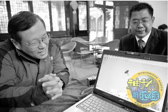 美籍华人查乐平博士(左)正在鉴定杨先生(右)的“UFO照片”