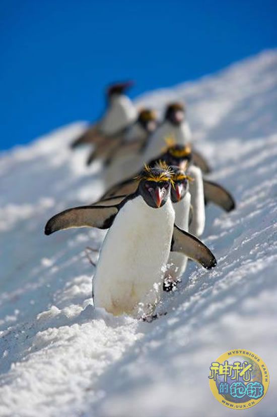 “当我为了取一个广角视野位置向山上爬的时候,我发现了一群企鹅穿过一座冰川。这让我使劲地大笑起来,因为我知道我必须拍下这情形。在花了30分钟用背滑下山后(谁说摄影没有乐趣的?),我重新整装待发,在晴朗美好的下午,我一直微笑,因为一波又一波的马卡罗尼企鹅从我面前的冰川上走过。”——Andrew Rouse