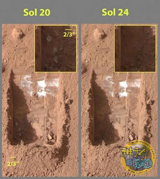 凤凰号探测器在火星北极挖开的沟糟中找到了水冰存在的证据