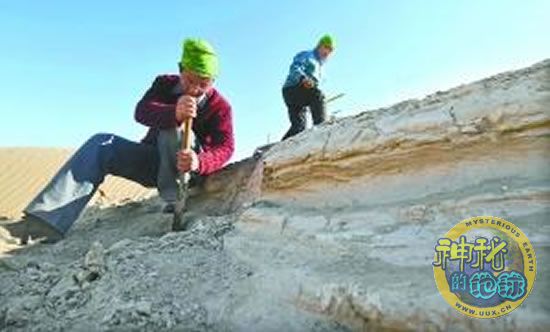 研究人员在罗布泊地区西部进行地质刨面采集