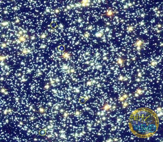 The core of globular cluster 47 Tucanae contains a number of "blue stragglers"—older stars that glow with the blue light normally seen from young stars (above, circled in yellow).