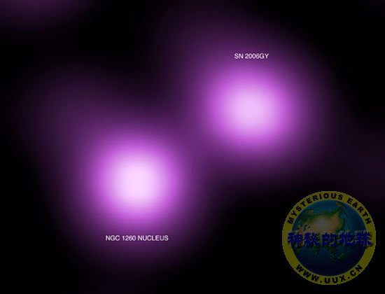 An x-ray image taken by NASA's Chandra X-ray Observatory reveals supernova 2006gy (left) shining as bright as the nucleus of its galaxy.
