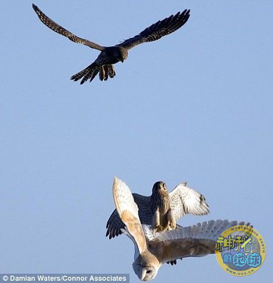 据英国《每日邮报》5日报道,摄影师近日拍摄到了猛禽“空战”的精彩照片。照片中显示,一直谷仓猫头鹰在白天觅食时遭到两只茶隼的伏击。