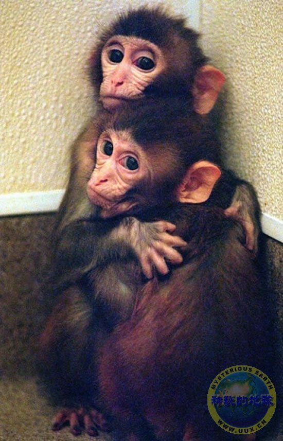 Two rhesus monkeys—born of DNA taken from cells of developing monkey embryos—huddle together at a research center in Oregon in 1997.