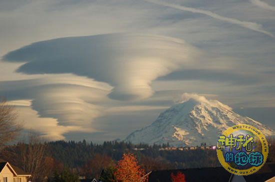 盘旋于那座山峰附近的是不明飞行物吗?不——它们是多层透镜状云。这些透镜状云是山顶周围上升的潮湿空气形成的。潮湿空气的温度低于露点,水滴就会在其中凝结,云就是由许许多多不透明的小水滴构成的。由于云形成的高度不同,空气中通常出现在水平方向上的波纹就会呈现在垂直方向上。有时候,在美国华盛顿州的西雅图市,当透镜状云在雷尼尔山(西雅图东南方不到100公里的一座高大山峰)附近形成时,天空就会显得如此不同寻常。这幅照片拍摄于去年12月,图中成群结队的透镜状云团可谓波澜壮阔。