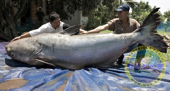 Two Thai fishermen show a 646-pound (293-kilogram) giant catfish—an endangered species—fresh from the Mekong River in northern Thailand's Chiang Rai province in mid-May, 2005.