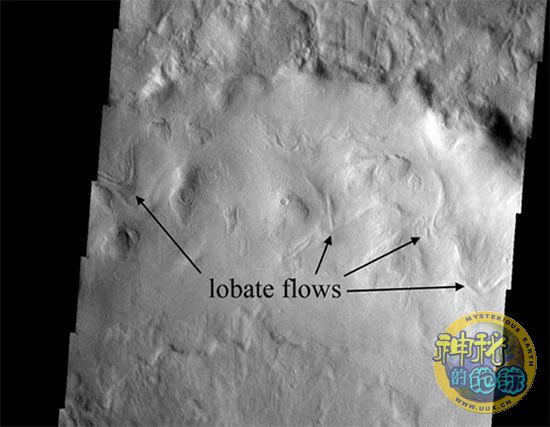 1、叶状河流――类似于地球上冰川石流的这种舌状沉积图案展现在海拉斯盆地的30个陨坑图像中。伯曼说:“我们看到此表面上的这些划线的沟槽方向都顺着此叶状河流,表明当时的冰正在流动和升华。”