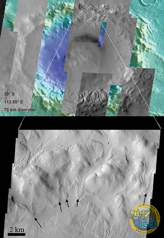 负责此项研究的美国亚利桑那州的行星科学院的丹尼尔·伯曼说:“如果你一个个地去看这些特征,就看不出明显证据表明曾有水或冰流经此表面。但如果你全面地观察这一区域的特征,你就会发现在几百万年前,有大量的冰有可能开始融化,越过这里的陨坑壁,流经此陨石坑。”