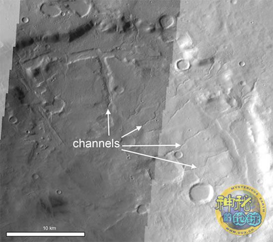 2、狭水道――在此两个地区的陨坑中,伯曼发现大约1-2米的狭水道在迂回曲折地流经这些陨坑壁,有些还流入了这些陨坑中。伯曼说:“它们是真正狭小的水道,这表明是水流。”