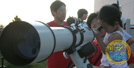 山东大学威海天文台用做科研的同时,也被用来为我市青少年进行科普教育。图为2007年8月28日,市民带孩子在利用天文台的望远镜观看“红月亮”。
