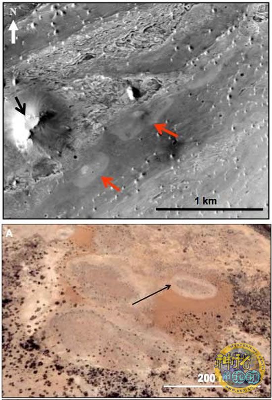 科学家们介绍说,在火星“阿拉伯地”地区分布着两片带有裂纹的堤状物,它们的构造看上去很像是达尔豪西地区的温泉口。