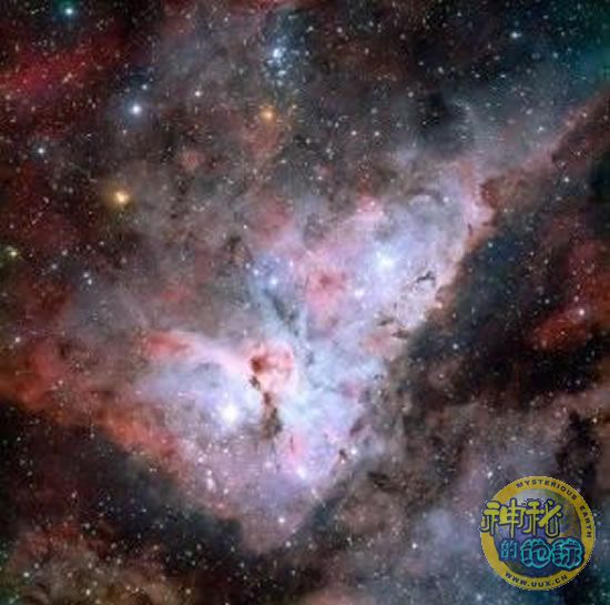 船底座星云的光辉主要来自氢的强大宇宙辐射。氢和紫外线照射的相互作用产生了红色和紫色。这个巨大的星云包括12颗怛星,起码是我们太阳的50到100倍。这些恒星的寿命很短,最多几百万年,比起太阳的百亿年的寿命就相当于是眨眼之间。
