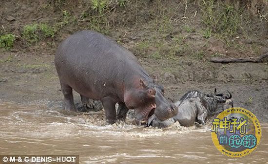 尽管那只黑尾牛羚看起来在劫难逃,不过,很显然,它最终逃过了河马的攻击。攻击事件发生在肯尼亚马塞-马拉国家公园的马拉河河岸。黑尾牛羚当时正和其它150万只黑尾牛羚行进在大迁徙的最后一段路程上,它们为寻找新的草地从坦桑尼亚出发前往肯尼亚。