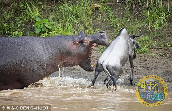 河马攻击黑尾牛羚不是为了充饥,事实上,河马是食草动物。那头看起来心情很差的河马攻击黑尾牛羚可能是因为自己的领地遭到侵犯而感到愤怒。