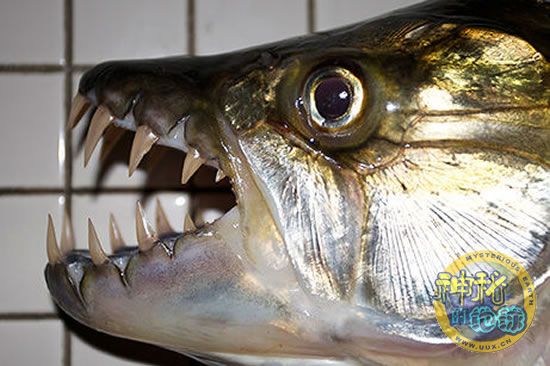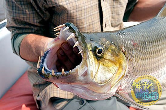 巨大老虎鱼是在刚果河中发现的一种魔鬼鱼,样子非常可怕。它有流线形的体形,分叉的尾鳍。它因其可怕的单排排列在唇周围的牙齿而得名,这些牙齿长而锋利,当上下颌并拢,上颌齿和下颌齿相互交错,但吻合整齐,靠近眼睛的鼻孔覆盖着一个象阀门的膜。它在水中游泳的速度非常快,捕食其他鱼类,它最大的个体可达68公斤,其肉白色好吃,但里面有许多讨厌的小骨刺。这种鱼是容易上钩的垂钓鱼。