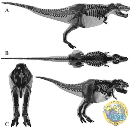 恐龙是巨型动物,即使给活恐龙称体重都是一个棘手的难题,更别说是利用恐龙化石来给它们称体重,现在这一难题得到解决。最近古生物学和生物力学研究小组的卡尔-贝茨( Karl Bates )和他的同事们根据5个恐龙化石和2个霸王龙化石制作成恐龙复原模型,使用激光成像技术测得洛矶山博物馆的较小的霸王龙可能体重介于5.5和7吨之间,而较大的可能重达8吨。