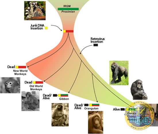 华盛顿大学生物学家艾文·艾希勒(Evan Eichler)对基因进化十分感兴趣,和同事们一起研究了许多不同种类的灵长类动物的IRGM基因序列。他们发现,在猴子身上,一种可以叫做“废弃DNA”的正好契合基因序列的开端。这个基因的插入使得基因的进化演变变得更加复杂,因为它正处于蛋白质繁殖的临界状态。然而,猴子的基因中有一些“停止密码子”,相当于一种基因运动的红灯信号,阻止了功能性蛋白质的繁殖。艾文说:“我们研究了全球15个地区从古至今各种猴类的基因,所有种类的猴类都成倍地繁殖了停止密码子,这说明,那种DNA已经死亡了。”