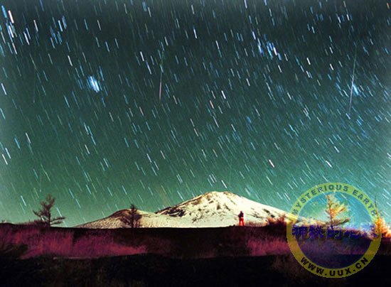 Leonid meteors dot the sky over snow-capped Mount Fuji, Japan's highest mountain, in a time-lapse photo taken November 19, 2001.