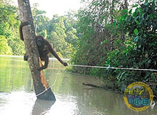 人们长期以来都认为猩猩怕水,但是这只猩猩母亲为了营救孩子毅然跳入上涨的河水中,这组照片是世界自然基金会官员在马来西亚婆罗岛拍摄的。当地村民称,他们发现一只雌猩猩和它的孩子受困于婆罗岛东北端洪流上涨的河水中,它们只得爬在一棵树上。还有人称,看到这对可怜的猩猩母子受困已多日。婆罗岛野生动物部门与世界自然基金会取得了联系,基金会立即派遣一支营救小组抵达地点,并搭建了一个绳索桥便于他们接近饥饿的猩猩母子。