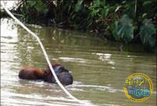 猩猩抓住绳索在河水中狗刨游泳