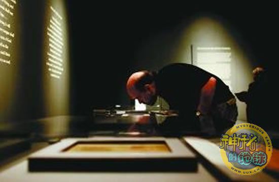 2008年9月17日,纽约,一名记者弯腰仔细观看“死海手卷”碎片。“死海卷轴:古代世界之谜”在纽约犹太博物馆展出。展品包括了死海卷轴的六段残留碎片,其中三段是第一次公开展出。