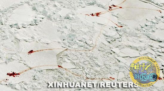 3月25日,在加拿大圣劳伦斯湾,格陵兰海豹被剥皮后在浮冰上留下残留的血迹。