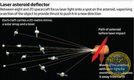 然而,采用激光很难将小行星推挤偏离地球轨道,英国格拉斯哥大学的马西米利诺·瓦西勒(Massimiliano Vasile)和同事们依据激光方法提供了一种摧毁小行星方案。发射8艘以上的宇宙飞船组成舰队,每艘宇宙飞船都携带激光装置,抵达会合在小行星的位置。宇宙飞船盘旋在距离小行星几千米的位置,每艘宇宙飞船都将展开20米宽的镜子,该镜子是由聚酯薄膜等柔韧材料构成,镜子将聚焦太阳光线至宇宙飞船的太阳能板上,为激光装置提供动力。宇宙飞船上的8个激光装置将同时对小行星表面的同一区域进行射击,将小行星的某一区域蒸发,形成气体烟雾,从而使小行星偏离轨道。研究小组称,这种激光方法将产生轻微推挤作用力,这种方法需要持续进行数月或几年时间。该方法不会使小行星分解产生任何小碎片。