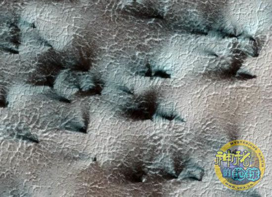 美国宇航局的火星勘测轨道飞行器(MRO)在围绕这颗红色行星运行,拍摄从覆盖在火星极地表面的固体二氧化碳层上的缝隙升起的气体尘埃烟柱时,拍摄到这些令人吃惊的火星春天奇特自然景观。因为大气中的二氧化碳遇冷会直接结成霜,在地面结成厚厚的一层,因此火星上的季节性极冠每年冬天都会形成,而且厚度可达1米。冬去春来的时候,干冰会直接由固体形态转变成气态,重新升到大气层里。