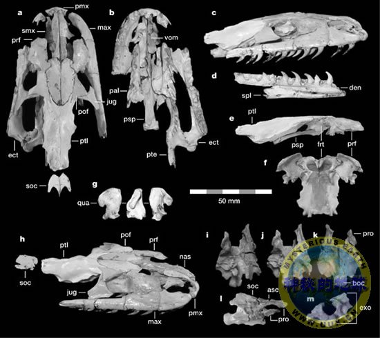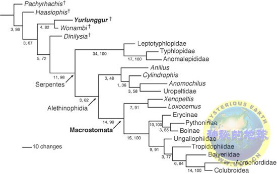 最古老的蛇类化石 来源: 神秘的地球 时间:2007年11月19日 16:58 蛇的早期演化是一个有争议的问题,而一个也许是迄今最好的头骨材料的发现将使这场争论更加激烈。研究人员说,新发现的头骨属于一种已经灭绝的蛇,名叫Yurlunggur,此前人们只找到其椎骨。Yurlunggur是一类名叫Madtsoiids的蛇类家族中的一个成员,这个家族的蛇更新世之前生活在澳大利亚。所发现的化石材料支持这样一种观点:Madtsoiids是已知最原始的蛇类,研究人员急切要对其进行研究,以寻找关于它们的蜥蜴祖先的线索。 新发现的头骨属于一种已经灭绝的蛇,名叫Yurlunggur 上一篇 下一篇 TAG: 化石 蛇类