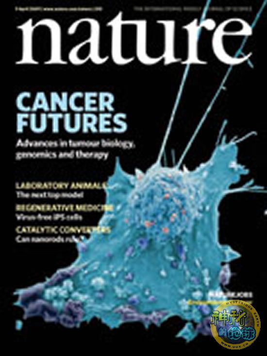 本期Nature包括一系列关于癌症研究领域一些最新进展的研究论文和综述文章。其中一篇综述文章回顾了上世纪80年代初以来癌症遗传学领域所取得的进展,展望了今后几年在癌症基因组学领域可能看到的进展。两篇论文分别报告了关于饮食和癌症的最新研究工作和“泛素—蛋白酶体”体系中的一个新颖的抗癌药物作用目标。Gao等人发现,Myc致癌基因(在很多人类癌症中发生突变)由一个对明胶蛋白酶的表达很重要的微RNA调控,从而在癌症与代谢之间建立起了一个联系。Hedgehog信号作用曾被发现与几种癌症有关,而现在Zhao等人发现,它在慢性骨髓性白血病中维持白血病干细胞的存在。Diehn等人对人类与小鼠乳腺癌中的癌症干细胞进行了分析,发现它们所含“活性氧”少于其他癌细胞,这可能是使得乳腺癌较之其他一些癌症对放疗不太敏感的一个因素。本期封面为一个乳腺癌细胞。