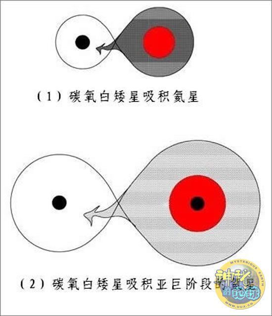 针对这一难题,韩占文创新团队首次提出了Ia型超新星前身星的碳氧白矮星加上氦星的双星模型。指出一个碳氧白矮星可以通过洛希瓣从一个氦星或者是一个处于亚巨阶段的氦星吸积物质,最后达到其最大稳定质量极限,从而发生Ia型超新星爆炸(如图)。这一模型可以解释年轻的Ia 型超新星的形成并与实际观测结果基本吻合。