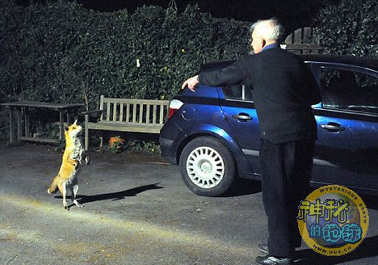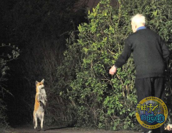 英国一群野生狐狸在一位老人训练下学会直立和乞讨食物