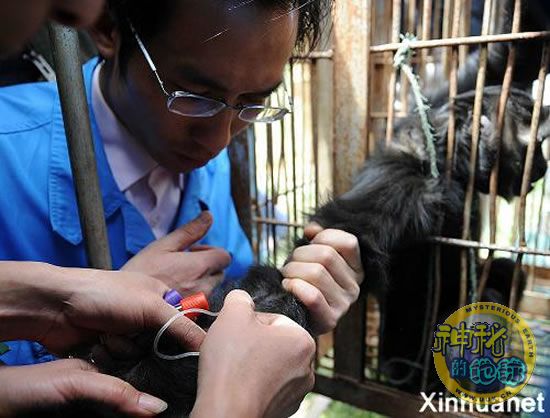 4月20日,云南野生动物园的工作人员为一只长臂猿植入“电子身份证”。
