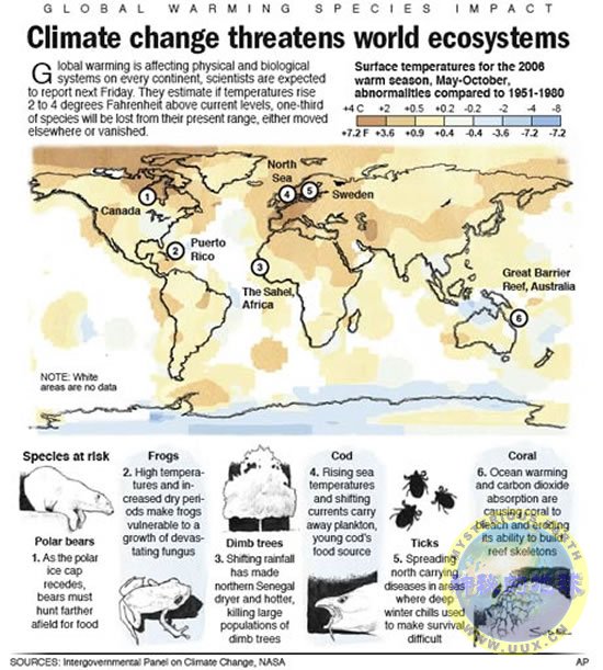 A graphic shows how some species are affected by changes in global surface temperatures.